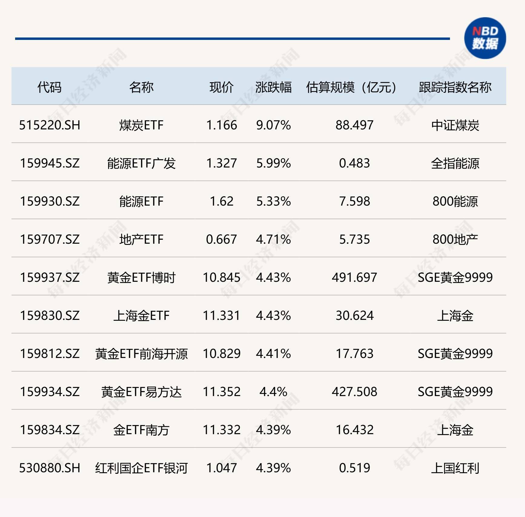 ETF涨跌幅方面,煤炭ETF涨超9%,能源相关ETF涨超5%。