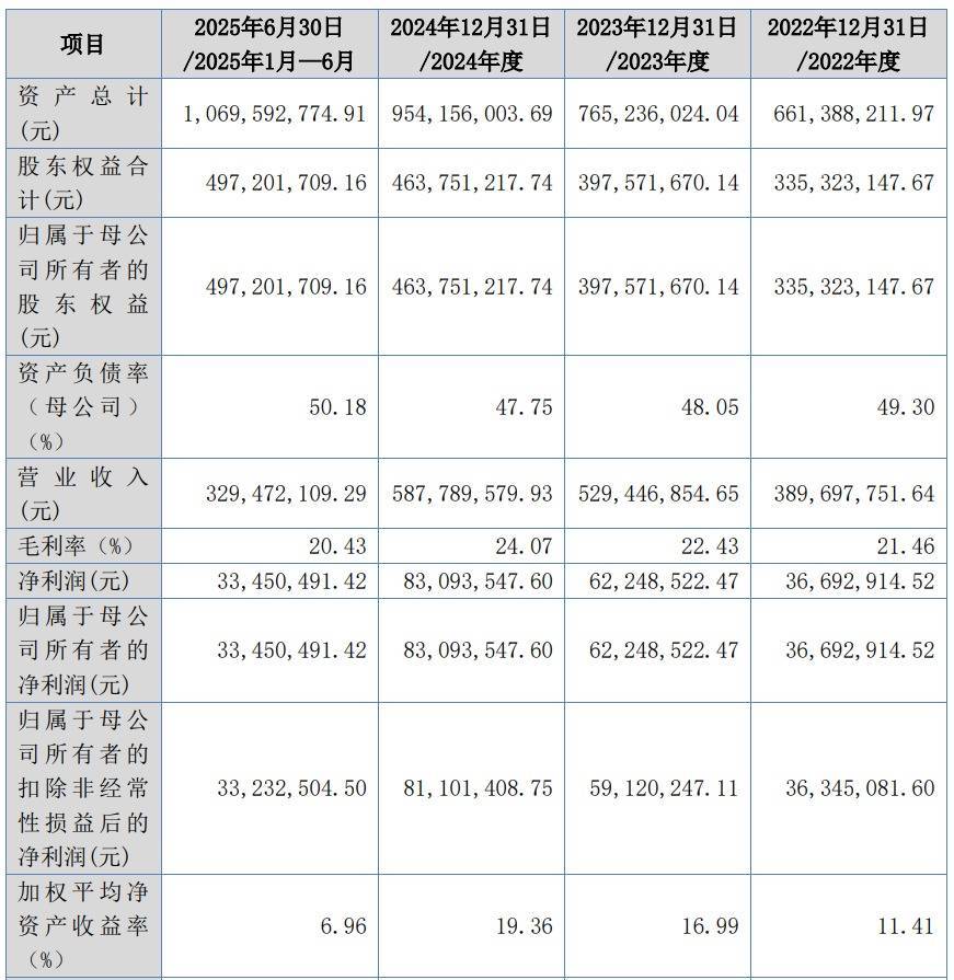 2022年至2025年1-6月,公司的营业收入分别为38,969.78万元、52,944.69万元、58,778.96万元和32,947.21万元;净利润/归属于母公司所有者的净利润分别为3,669.29万元、6,224.85万元、8,309.35万元和3,345.05万元;归属于母公司所有者扣非净利润分别为3,634.51万元、5,912.02万元、8,110.14万元和3,323.25万元。