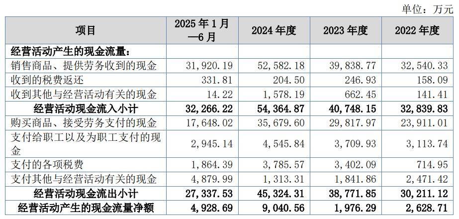 上述同期,公司销售商品、提供劳务收到的现金分别为32,540.33万元、39,838.77万元、52,582.18万元和31,920.19万元;经营活动产生的现金流量净额分别为2,628.71万元、1,976.29万元、9,040.56万元和4,928.69万元。