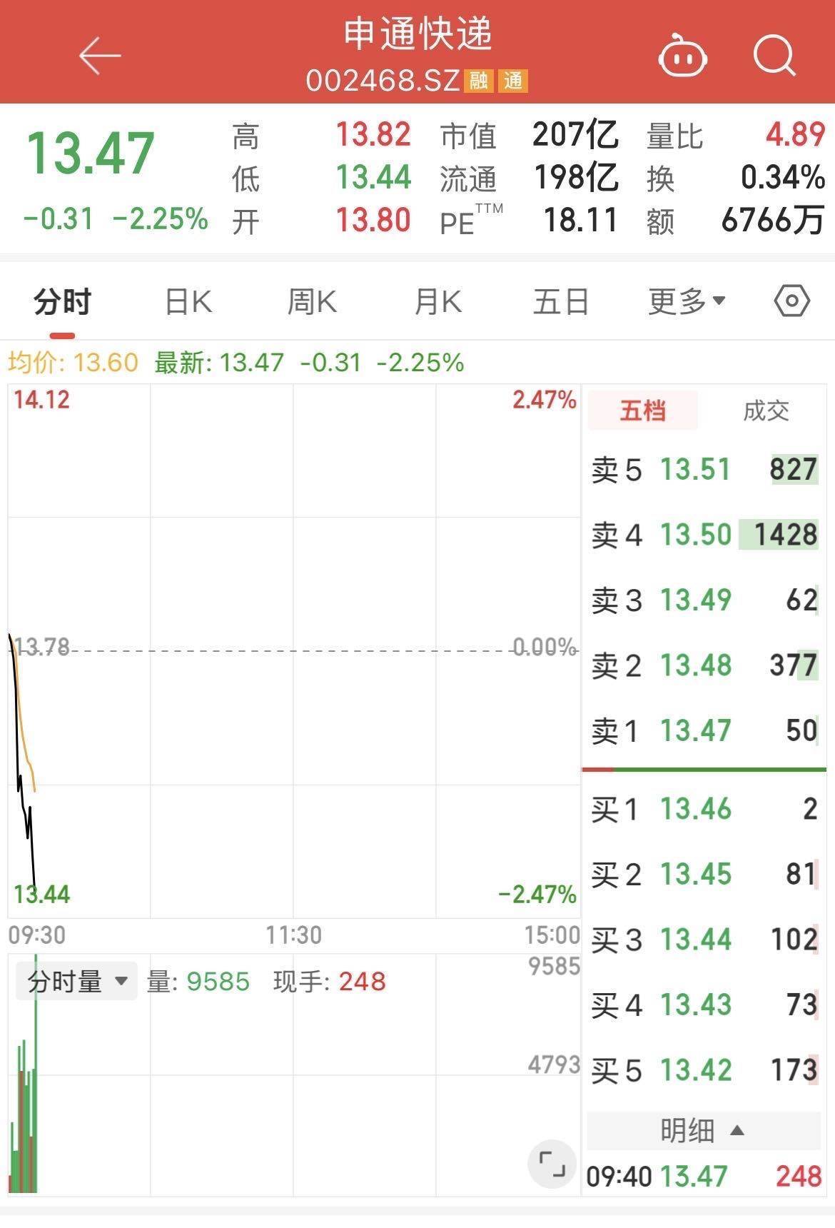 1月22日东莞股票配资,申通快递股价逆市下跌,截至9时41分,报13.47元/股,跌幅达2.25%,总市值207亿元。
