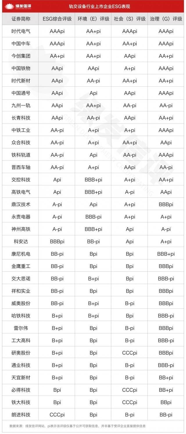 时代电气、中国中车凭借在环境、社会与治理三大维度的均衡优异表现,获得AAApi评级,位居行业第一梯队。今创集团获得AA+pi评级,中国铁物、时代新材、中国通号、九州一轨和长青科技获得AApi评级,中铁工业、众合科技、铁科轨道、晋西车轴获得AA-pi评级,位列第二梯队。交控科技和高铁电气获得Api评级,鼎汉技术、永贵电器、神州高铁获得A-pi评级,科安达获得BBBpi评级,构成第三梯队。