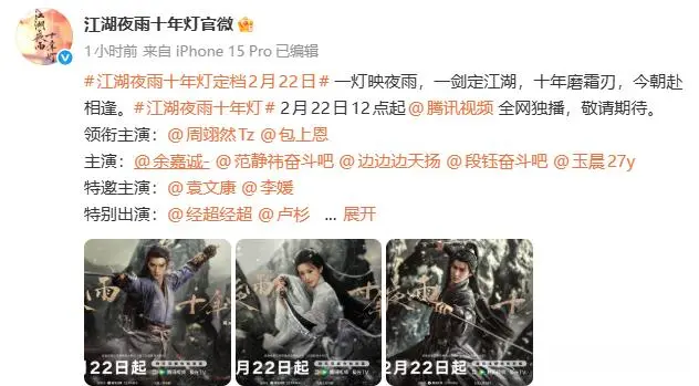 由周翊然、包上恩领衔主演的古装武侠剧《江湖夜雨十年灯》,定档2月22日在腾讯视频独播。