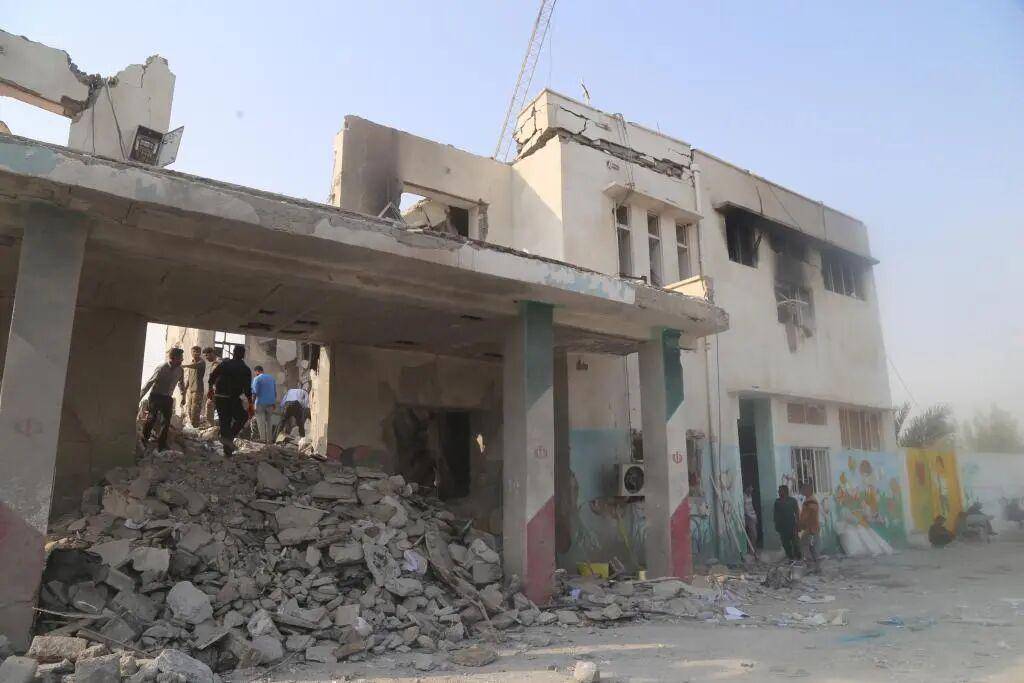 2月28日,在伊朗南部米纳卜市一所被袭击的小学,救援人员和当地居民试图从废墟里营救伤员。新华社发