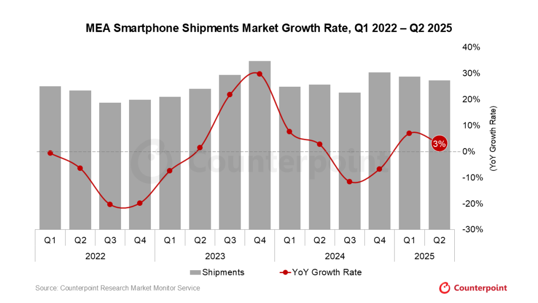 根据Counterpoint市场监测服务的最新研究,2025年Q2,中东非地区智能手机出货量同比增长3%,为该地区连续第二个季度增长。增幅受到宰牲节(Eid al-Adha)期间的销售与促销、区域经济好转以及更强的本币支撑下的消费力提升所推动。这些因素释放了被抑制的需求,OEM与分销商随之提升供货量,许多品牌也在节庆季前清理旧库存。
