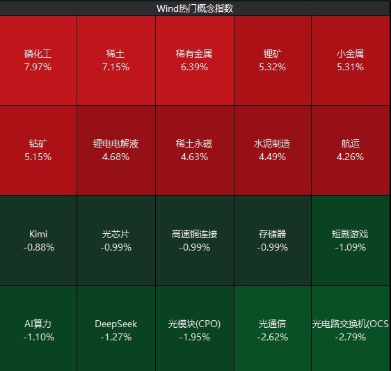 市场通胀交易延续。今日,磷化工、稀土、稀有金属等概念爆发,Wind磷化工指数大涨8%,稀土概念指数上涨7%,稀有金属概念指数大涨6%。