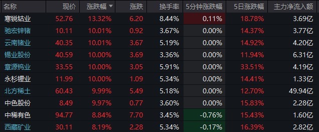 稀有金属板块表现活跃,华锡有色、锡业股份、云南锗业、章源钨业等涨停。