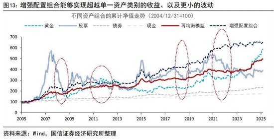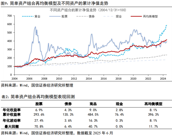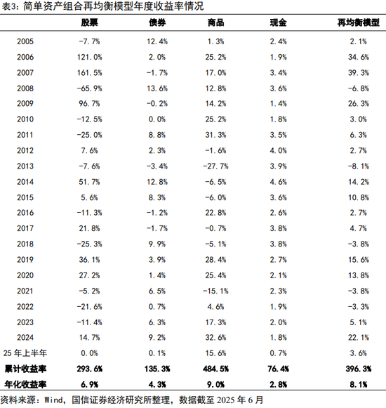 增强版配置组合收益率明显提高,波动性小幅上升。从收益率看,2005/01/01-2025/06/30期间增强版配置组合年化收益率为9.8%、累计收益率为575%(下同),明显高于股市(6.9%、294%),也高于简单再均衡模型(8.1%、396%)。从最大回撤看,2005年以来增强配置组合的最大回撤-18.3%,同样低于股市的-70.8%、商品的-40.7%,高于简单再均衡组合的最大回撤-11.7%。年度最差表现为-7.4%,远好于股市的-65.9%、商品的-27.7%,略好于简单再均衡的-8.1%。