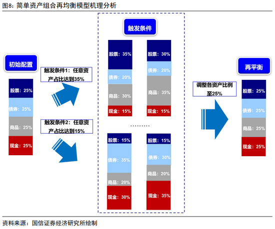 简单的资产组合再均衡模型:永久投资组合。《哈利·布朗的永久投资组合——无惧市场波动的不败投资法》一书提出“永久投资组合”,投资者在初始状态把投资组合均匀配置在股票、债券、商品、现金中,即四类资产初始配置比例都是25%,若投资组合中的任一资产比例跌至15%以下或涨至35%以上,则重置投资组合,使得每一类资产配置比例回到初始状态,如此往复,详见图8。