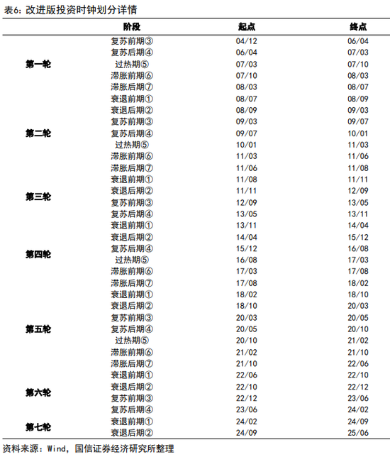 我们进一步考察改进版投资时钟在国内的运用效果。考虑到大部分资产价格指数从2004年之后才比较完整,以2004年末为起点,至今完整的投资时钟一共有六轮,分别是2004年末-2008年中、2008年中-2011年中、2011年中-2013年底(半轮)、2013年底-2018年初、2018年初-2022年中、2022年中-2023年末(半轮),目前尚处在第七轮周期中,详见表6。我们分别以中证10年期国债指数、万得全A、南华商品指数和货币基金指数衡量四类资产表现,整体上中国的大类资产表现符合改进版投资时钟规律,详见表5。
