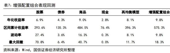 根据改进版投资时钟,构建增强版资产配置组合。前文指出,简单再均衡组合能够平滑收益率波动,但回报率不够高,我们是否能够构建一个收益率更高且波动较小的组合呢?改进版的投资时钟为我们提供了思路,如果在投资时钟的各阶段配置较高比例的强势资产、较低比例的弱势资产,能实现收益率的增强和波动率的降低。