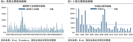 此外,从牛熊市涨幅和年度振幅看,股市波动大,A股比美股更显著。1900年以来道琼斯工业指数的年度振幅(最高价/最低价-1)均值为35%,7次牛市年化涨幅的均值为20%,6次熊市年化跌幅的均值为-32%。A股波动更大,1990年以来万得全A的年度振幅均值为83%,7次牛市年化涨幅的均值为159%,7次熊市年化跌幅的均值为-48%。