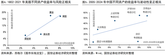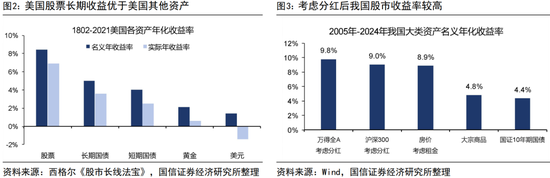 进一步将股市与其他资产比较,股市长期收益率更高。以美国市场为例,1802-2021年美国股票、长期国债、短期国债、黄金、美元的名义收益率分别为8.4%、5.0%、4.0%、2.1%、1.4%。我国大类资产的收益率表现呈现出相似特征,2005-2024年,万得全A(考虑分红)年化收益率为9.8%,沪深300指数(考虑分红)的年化收益率达到9.0%,以全国新房销售额除以销售面积计算的房价年化涨幅为6.7%,若考虑租金年化收益率2.2%,房市的年化收益率为8.9%,南华商品指数代表的大宗商品年化收益率为4.8%,以中证10年期国债指数衡量的债券年化收益率为4.4%。