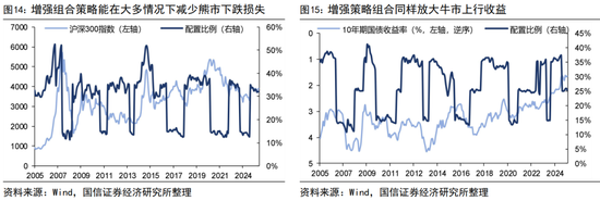 增强版配置组合的收益率更高,关键在于不同经济阶段对资产的合理配置。回顾2005年以来增强配置策略、简单再均衡模型以及其他单一资产的净值走势,我们发现该策略通常能够较好地在熊市阶段通过低配实现风险规避,并高配强势资产以放大其在牛市中的收益,例如在2007、2010、2017、2021年A股市场大跌前夕,投资时钟均显示当时经济环境已由过热(阶段⑤)步入滞胀前期(阶段⑥),将股市由高配调整为低配,由此避免了市场下跌带来的更大损失,详见图14。类似的,在2006、2008、2015、2020、2022年末债券市场迎来牛市上涨时期,投资时钟同样提示提升债券的配置比例,详见图15。