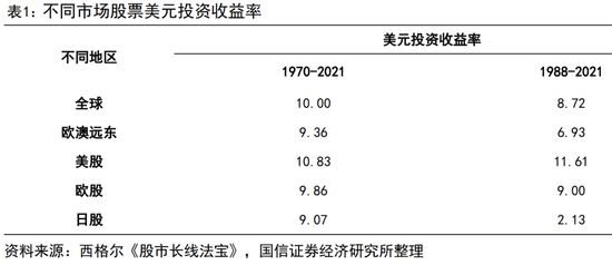 长期维度看各类资产收益率,股市>债市>商品。长期数据显示,全球范围股市年化收益率8-10%左右。根据《股市长线法宝》一书数据,1900-2020年全球股市剔除通胀后的实际年化收益率是5.3%,美股为6.6%。如果考虑通胀,名义投资回报率会更高。根据荷宝投资Robeco的数据,过去百年全球通胀4%左右,这意味着全球股市名义年化收益率大约9%。此外,《股市长线法宝》一书中统计了1970-2021年不同股市的美元投资收益率,全球市场美元投资收益率大概在10%左右,其中美股收益率最高,达到10.8%,新兴市场的美元投资收益率也较高,1988-2021年为10.5%。
